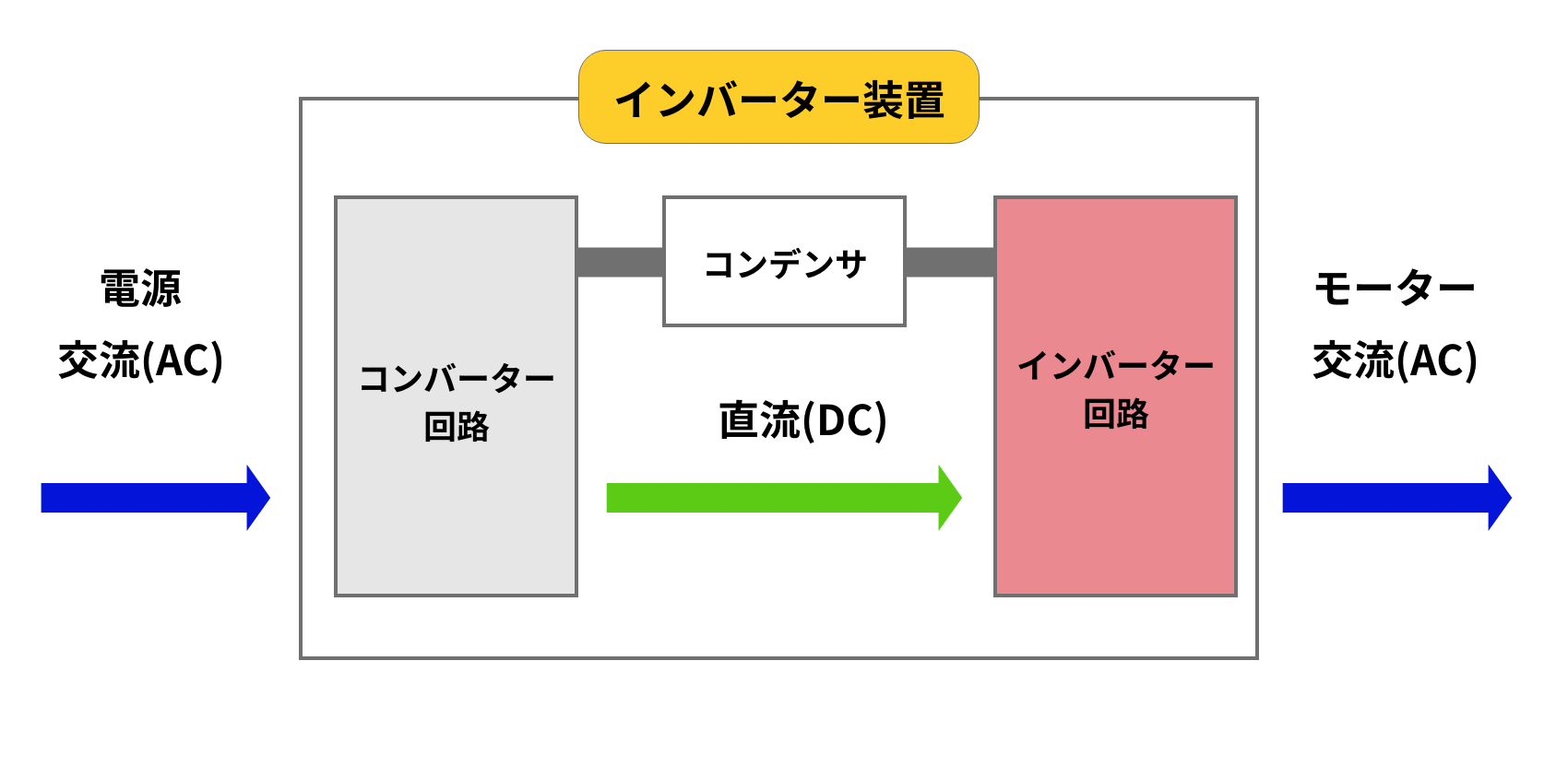 ※1:インバーターとは、電気の流れを変える装置です。いったん交流(AC)を直流(DC)に変え、そこからもう一度交流(AC)に戻します。このとき交流の「周波数」や「電圧」を自由に変えられるので、モーターの回転数などをコントロールできます。
