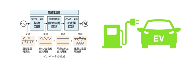 インバータは直流電力を交流電力に変換する装置で、家電や産業用機器に組み込まれています。これにより、交流電力の電圧や周波数を調整してモータの回転数を制御し、モータの効率向上と省エネルギー化が実現されています。世界の消費電力の約半分がモータによるもので、EVの需要増加に伴いモータとインバータの需要も広がっています。これにより、ますますの省エネルギー化が期待されています。