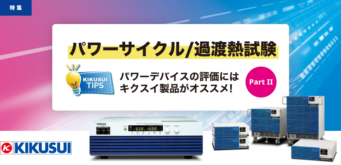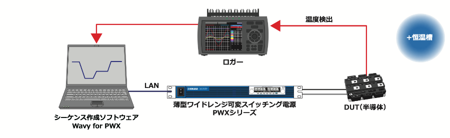 パワーサイクル試験では、測定した温度に応じて、電流値を制御し実車の温度変化パターンを再現します。温度検出によるフィードバック制御を実現するためには、通信処理時間の早い直流電源が必要です。試験には、菊水電子工業の薄型ワイドレンジ可変スイッチング電源 PWX シリーズがオススメです!