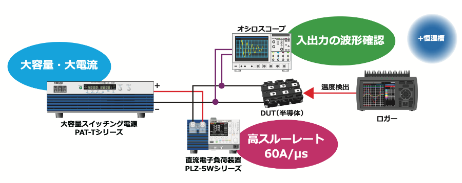 大電流を高速で立ち上げて、半導体の温度変化を測定します。試験の際には、数百 A~千数百 A を数 ms で立ち上げる必要があります。菊水電子工業の大容量直流電源 PAT-T シリーズと電子負荷 PLZ-5W シリーズを組み合わせることで、高速大電流を実現できます。