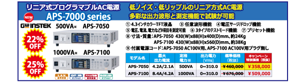 APS-7050 | 500VA | 0~155.0 | 4.2Arms | ¥460,000 | ¥358,000 | 2016年1月末より |