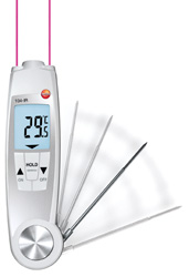 testo 104-IRは折りたたみ式のボディに食品の中心温度を測定できる中心センサと、表面温度が測定できる赤外線センサが付いています。これ1台で食品の中心温度、表面温度の両方が測定できます。