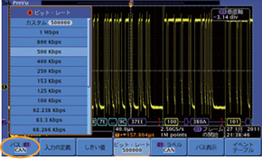 | CAN/LIN CAN信号では、1Mbpsまでのフレームの開始、フレーム・タイプ、識別子、データ、識別子とデータ、フレームの最後またはアクノレッジの喪失でトリガ | ![]() | ![]() |