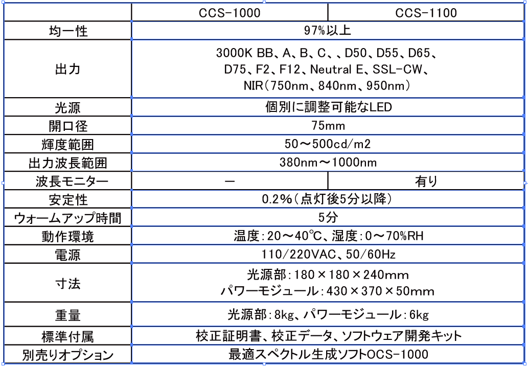 CCS-1100 はCCS-1000 と同等の性能を持ち、スペクトラムのモニター機能を持つことにより、高性能で調整可能な均一光源と言うだけでなく、出力のスペクトラムをモニターするということもできるようになります。