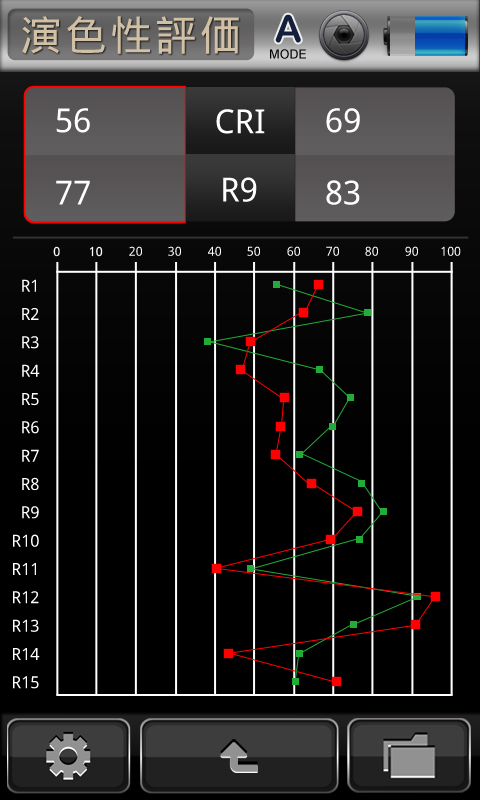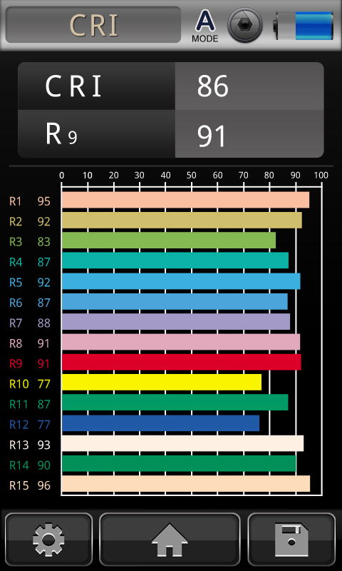 PC不要で、機器上でも一目で演色性評価数(Ra & R1~R15)及びカラーバーを判明します。