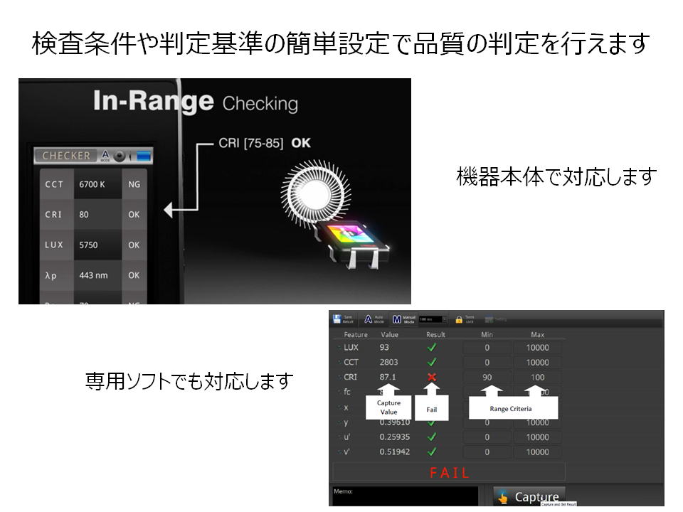 機器上で自由に検査項目や判定基準を持って、LED製品や照明器具の検査・判定を行えます。
