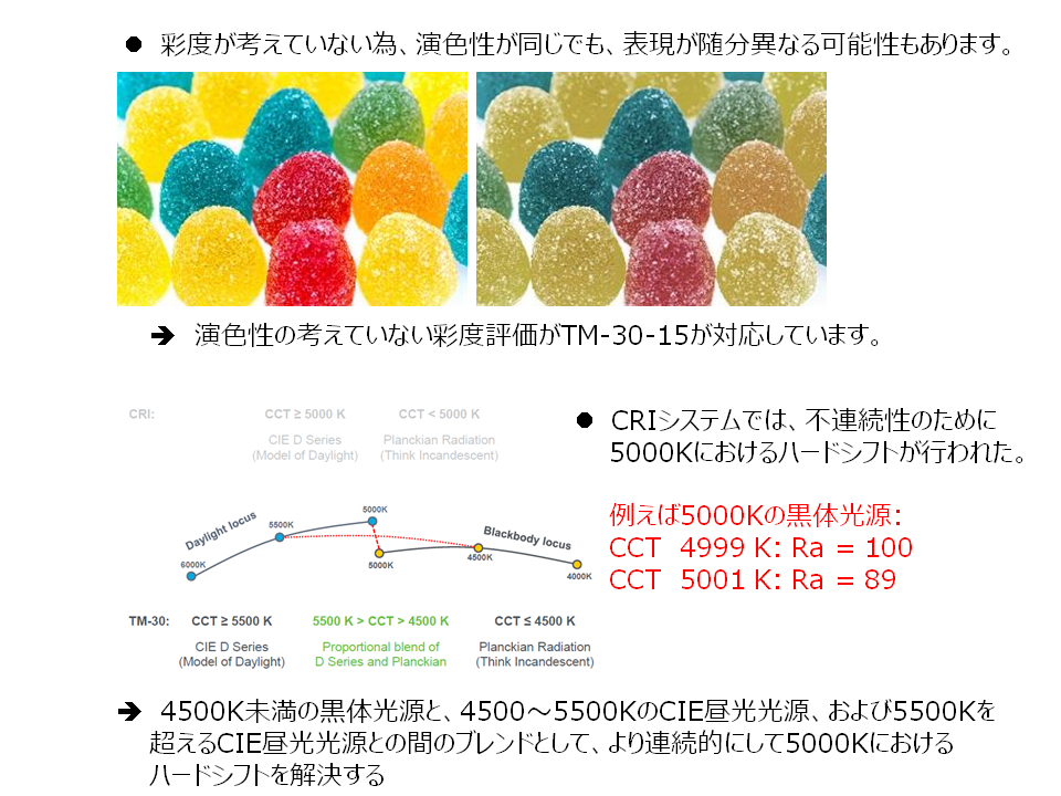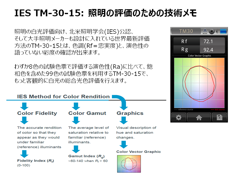 照明の白光評価向け、北米照明学会(IES)公認して、大手照明メーカーも設計に入れている世界最新評価方法のTM-30-15で、色調と演色性の語っていない彩度の確認が出来ます。わずか8色のカラーサンプルで評価する演色性(Ra)に比べて、99色のカラーサンプルを利用するTM‐30で、もっと客観的に白光の総合光色評価を行えます。