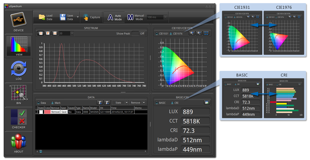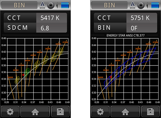デバイス上で即時にLED製品の色度バラつきに対して、ランク分けの出来るビニング機能とMacAdam SDCM機能も完備です。PCソフト上には、米国Energy Star BIN ANSI78.377の他に、ニーズによってBINの範囲をユーザー設定で進められます。