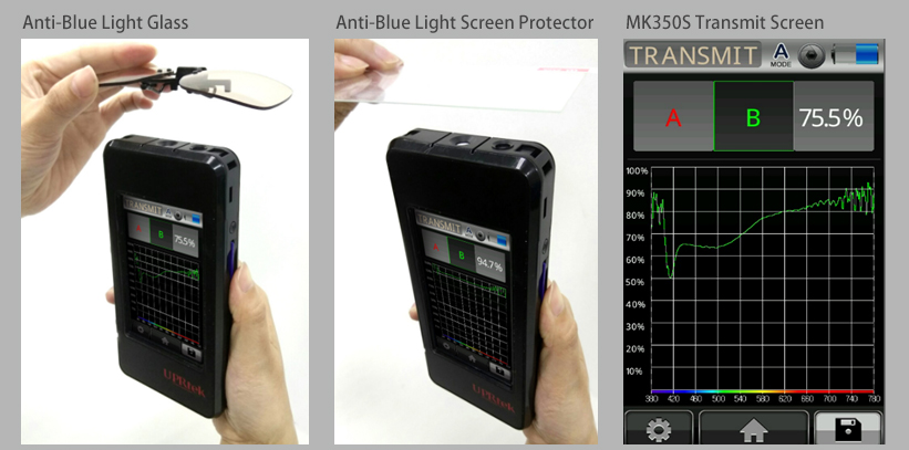 近年、青色発光ダイオード光による網膜光障害が注目されています。この問題に関わるBLUE LIGHTの透過率に伴う分光状況で、モニター・スマートフォン向けブルーライトをカットするフィルム・レンズ・ガラス、たは眼鏡屋さん向け、アンチブルーライト用途のメガネ・サングラスの検査が簡単に行えます。