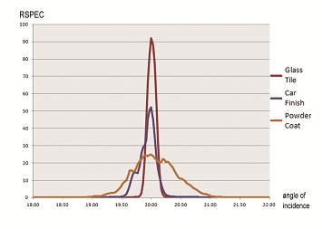 Rhopoint(ローポイント)IQシリーズは、鏡面反射(正反射)方向に反射する光をフォトダイオードアレイを使用し、受光します。各測定項目毎に反射ピークに対して、それぞれ既定の角度の受光量を読み取り測定値演算を行います。