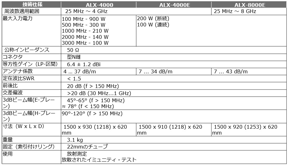 ALX-4000は、25MHzから最高4GHzの周波数適用範囲でほとんど全ての適切な国際規格に従う放射測定とイミュニティ・テストのための超広帯域アンテナです。その機械的な構造について、より高周波数適用範囲向けの線形分極化する対数関数的周期的な広帯域アンテナです。そして、低周波数適用範囲向けの4:1のブロードバンド・ダイポール(アルミニウム)と組み合わせられます。この種の超広帯域アンテナは、EMCテストの性能を、時を費やすアンテナ交換なしで1つの実行でできます。