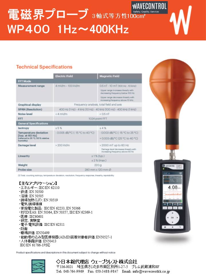 Wavecontrol(ウェーブコントール)社製のprobe、WP400は、広周波数範囲1Hz~400KHz 等方性電界&磁界測定プローブ。スペクトラム解析も可能な 2in1 プローブ。