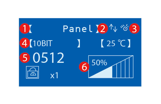![]() | ① 操作モード ② フィードバック機能アイコン ③ 点灯アイコン ④ 調光分解能 ⑤ 調光値 ⑥ 調光インジケーター |