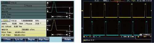 2CHモデルは、正弦波、方形波、三角波、パルス、ランプ波(ノイズ波形、DC電圧と任意波形を除く)で2チャンネル間の信号位相を制御できます。位相は、-180.0度~180.0度まで0.1度単位で設定できます。