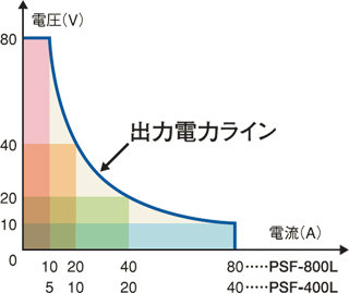 定格電力範囲内において電圧・電流をフレキシブルに出力することが可能です。PSF-Lは10V~80Vまでの8倍比の範囲で定格電力出力が可能、PSF-Hは133V~800Vまでの6倍比の範囲で定格電力出力が可能です。 |