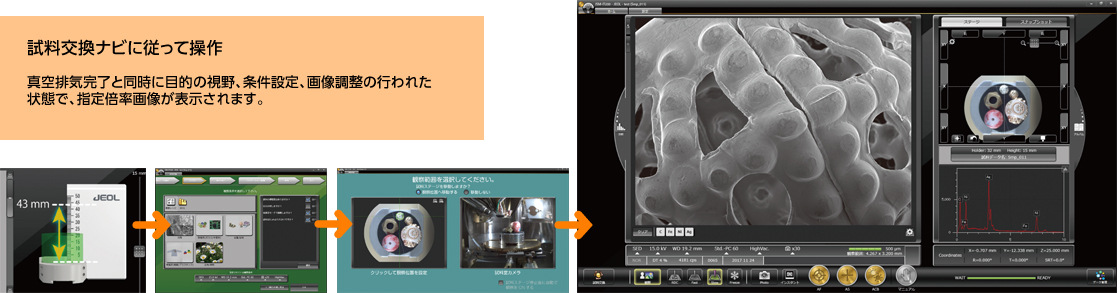 試料交換ナビは、試料室を開けるところから観察開始までナビゲーションを行う機能です。