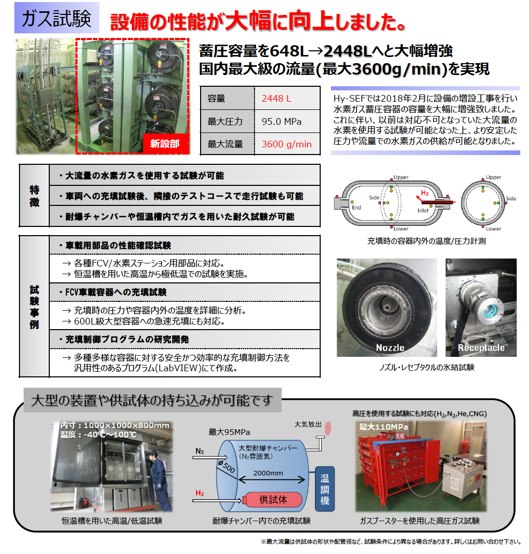 水素・燃料電池自動車安全評価試験施設 ・ガス試験 設備の性能が大幅に向上しました。 ・液圧試験(各種容器に対応可) 破裂試験等のハイスピードカメラ撮影が可能 ・爆発・火災試験 爆発、燃焼リスクがある多様な試験が実施可能 製品名 水素・燃料電池自動車安全評価試験施設 型番 - 価格 お問合せ下さい 発売日 受付中です。お気軽にご相談ください。 お問い合わせはこちら お問い合わせはこちら