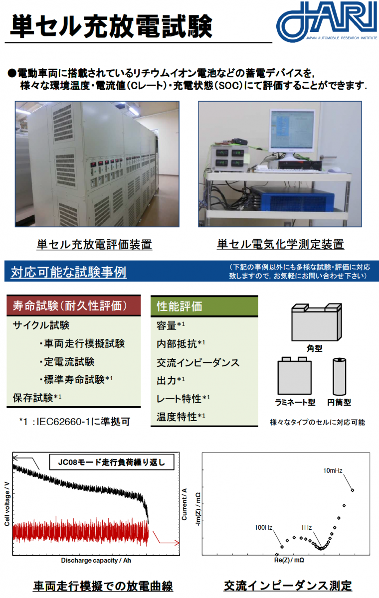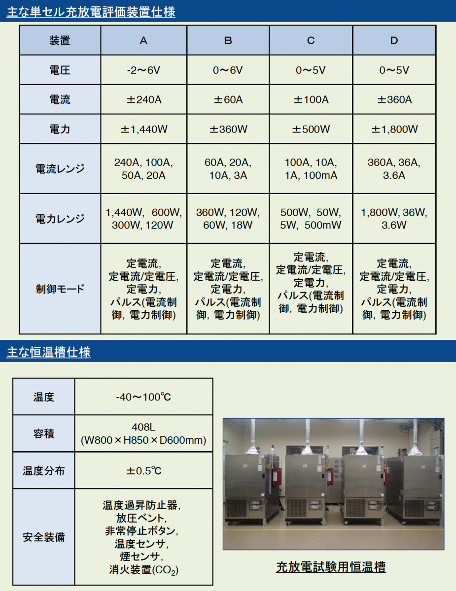 電動車両に搭載されているリチウムイオン電池などの蓄電デバイスを様々な環境温度・電流値(Cレート)・充電状態(SOC)にて評価することができます。
