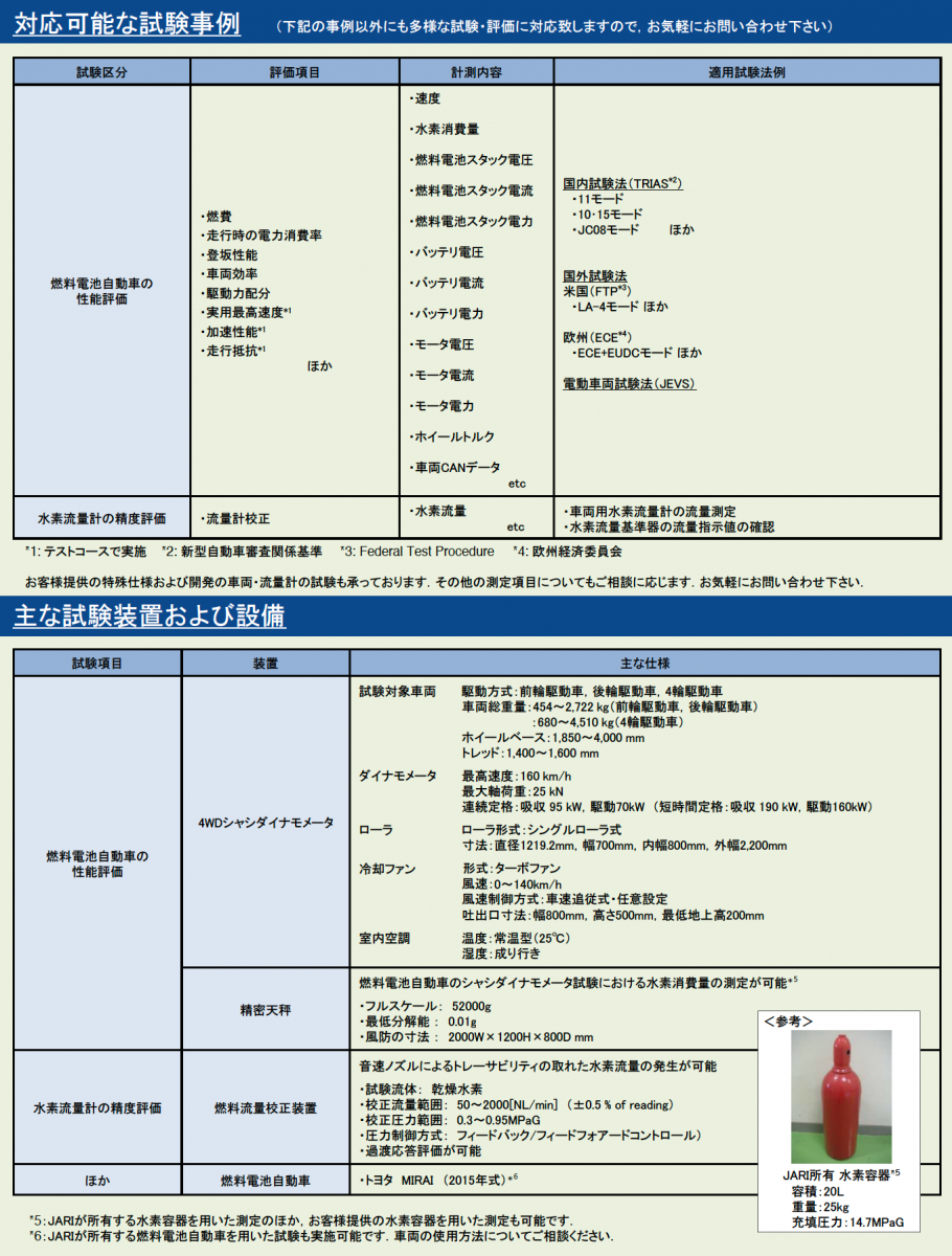 多様な試験・評価に対応致します。 ・水素消費量の測定などを含めた燃料電池自動車の性能評価試験 ・燃料電池自動車に関わる水素流量計の精度評価 製品名 燃料電池自動車の性能評価試験 型番 - 価格 お問合せ下さい 発売日 受付中です。お気軽にご相談ください。 お問い合わせはこちら お問い合わせはこちら