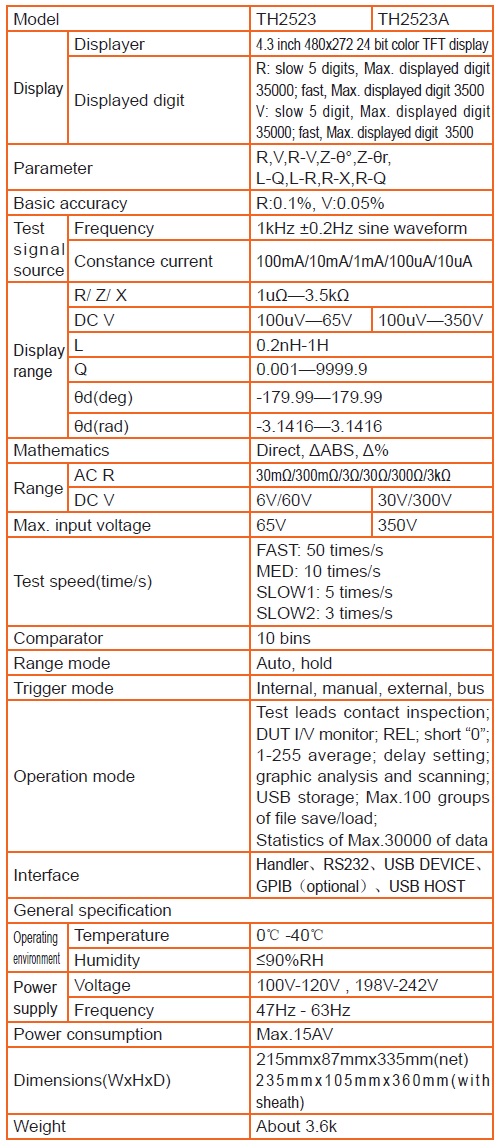 TH2523シリーズは最新のバッテリ技術に対応した、高確度、高分解能、高速で、電圧および抵抗を測定するバッテリ・テスタです。さらにインダクタス、キャパシタンス、D (損失係数)、インピーダンス、Q (Q値) 、リアクタンス、位相角 (度数およびラジアン)といった補助項目の測定も可能です。