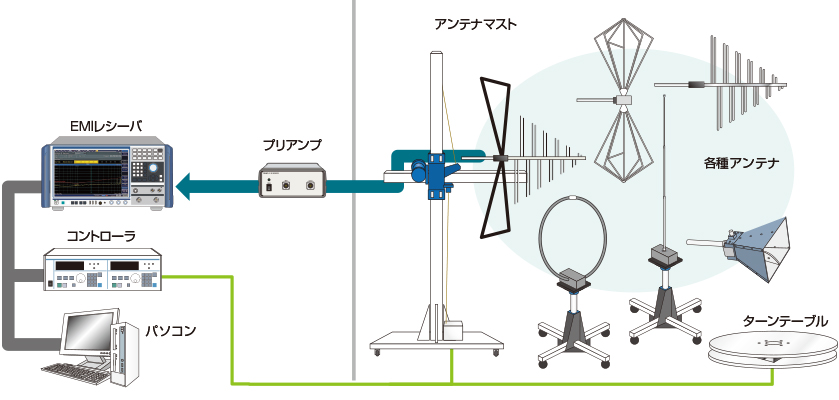 供試品(DUT)より発生する放射性ノイズ/伝導性ノイズをアンテナやプローブで検出し、EMI レシーバなどを用いて周波数およびレベルを測定します。