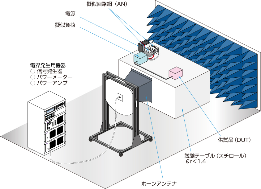 電波暗室内に供試品(DUT)を設置し、さまざまなアンテナで規定の周波数・試験レベルの電磁波を照射し、耐性を評価します。