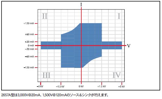 2657A型は2600Aシリーズ同様、大変フレキシブルで、電圧・電流を印加する電源および負荷として4象限動作するばかりでなく、精密な電圧/電流の測定が行えます。2657A型は次の機能を提供します。