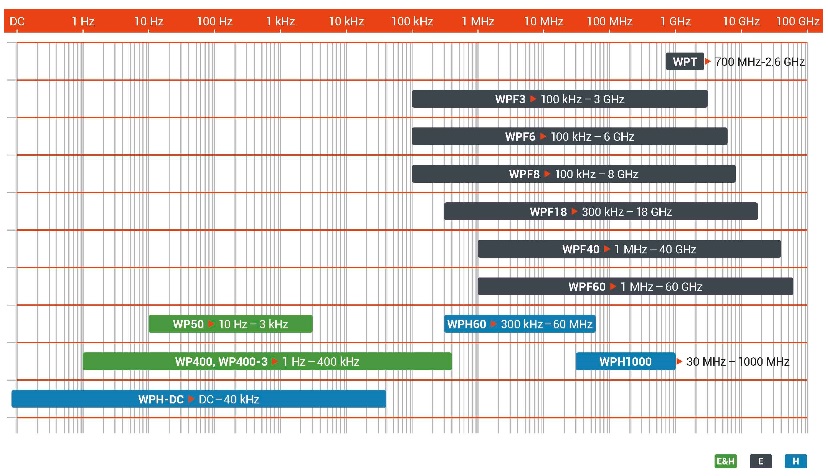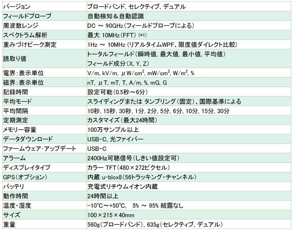 測定レンジ:1 – 1000 V/m (CW)、1 – 55 V/m (RMS)
