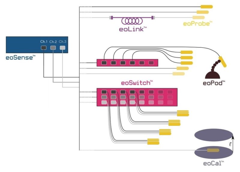 オプトエレクトロニックコンバータ eoSense は、eoProbeセンサと、専用のKapteosソフトウェア、または独自のソフトウェアからイーサネットポートを介して使用します。 eoSense は、eoProbe 3本まで直接接続させて動作可能です。eoProbeから送信された光信号を、オシロスコープやスペクトラムアナライザ、その他の信号処理機器などで分析できる電気信号に変換します。