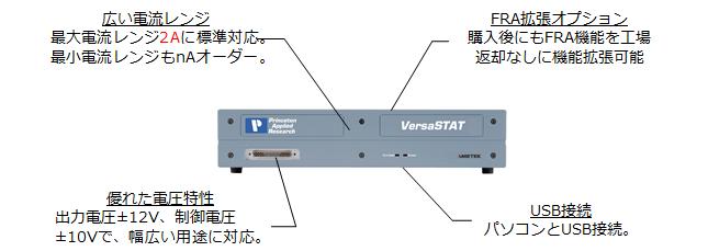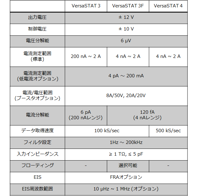 VersaSTATシリーズでは、、VersaSTAT3の他にも、フローティング測定が可能なVersaSTAT3F、4nA電流レンジ・高速サンプリングに対応したVersaSTAT4の全3種類をご用意しています。