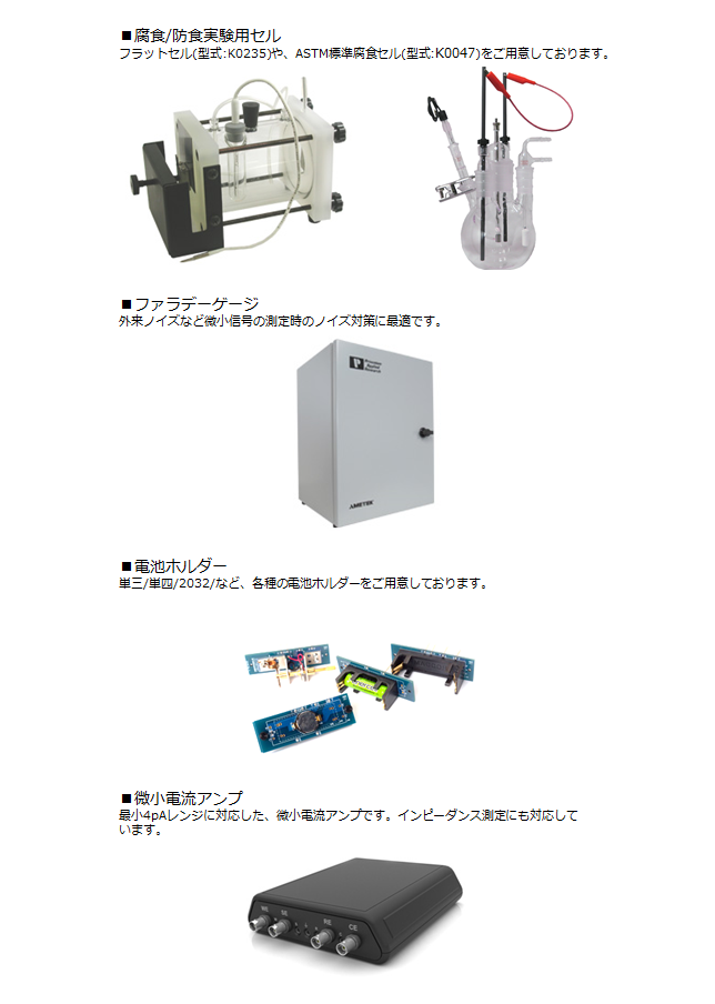 ポテンショスタット本体の他にも、様々なアクセサリをご用意しています。腐食実験用のフラットセルや、外来ノイズ対策用のファラデーケージなど、幅広いラインラップをご用意しています。
