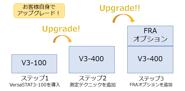 VersaSTATは、お客様自身でオプションを追加することが出来ます。まずはベースとなるVersaSTAT3-100を導入しましょう。その後、アップグレードをご購入頂くと、アクティベーションコードを入手することができます。コードを測定ソフトウェアVersaStudioに入力すること、素早くアップグレードが可能です。余ったご予算で段階的に機能拡張頂けます。