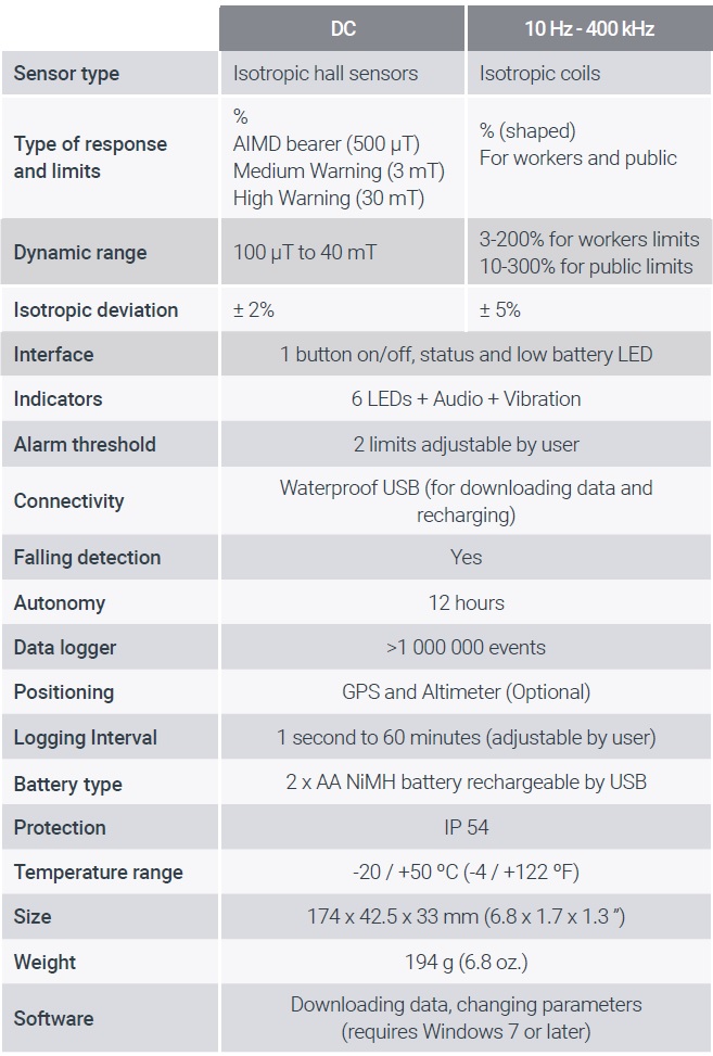 ダイナミックレンジ:<DC>100μT-40MT <10Hz-400KHz>3-200%(労働者制限), 10-300%(公衆制限)