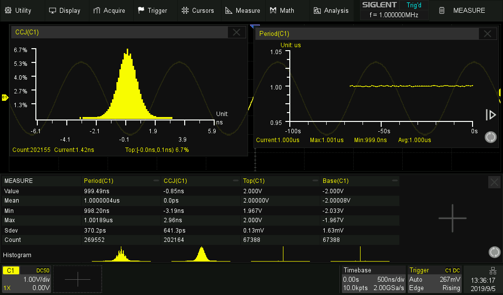 統計には、最大12個のパラメーターの現在値、最大値、最小値、標準偏差、および平均値が同時に表示されます。 パラメータの確率分布を示すヒストグラムを使用できます。 パラメータ値と時間を示すトレンドを利用できます。 さらに、水平測定では1つのフレーム内で最大1000の信号エッジを処理できるため、テスト効率が大幅に向上します。