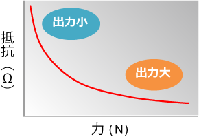 特殊導電部材(ゴム・フィルム)と電極で構成され、押し圧に応じて検出部と電極の接触面積が増減することにより電気抵抗が変化し力の大小を見える化します。