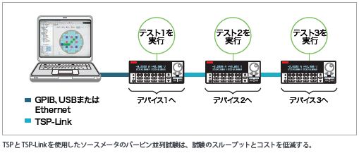 大規模なマルチ・チャネル向けのアプリケーションでは、ケースレーのTSP-Link®テクノロジがTSPスクリプトと連携して動作し、高速パルサーまたはソースメータを使ったパラレル・パーピン試験が可能になります。 メインフレーム無しで完全なアイソレーションを提供するため、テスト・アプリケーションの進化に応じて簡単に再構成できます。