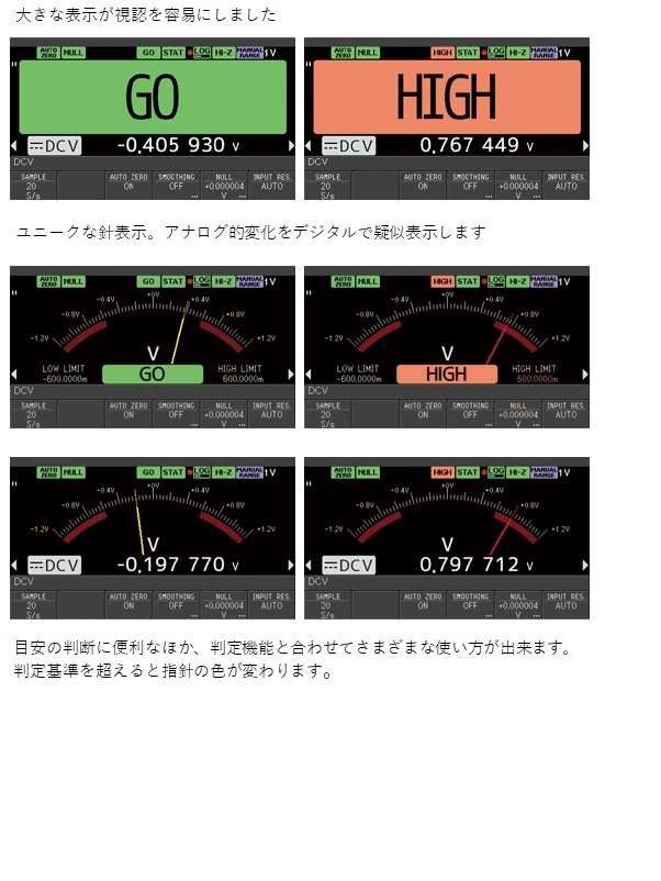 色鮮やかな大画面 多彩な解析機能 (アナログメータ、ヒストグラム、トレンドなど) 純日本製 6½桁(7602) 5½桁(7502) 見やすい大画面 (高解像度 液晶モニタ 4.3 インチ109mm) 製品名 デジタル・マルチメータ 型番 VOAC7602/7502 価格 135,000 円~ 発売日 発売中 お問い合わせはこちら お問い合わせはこちら