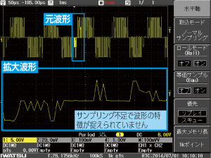 | 波形取込時間:10ms(1ms×10div) メモリ長:1k ポイント、サンプリング速度:100kS/s | 波形取込時間:10ms(1ms×10div) メモリ長:500k ポイント、サンプリング速度:50MS/s |
