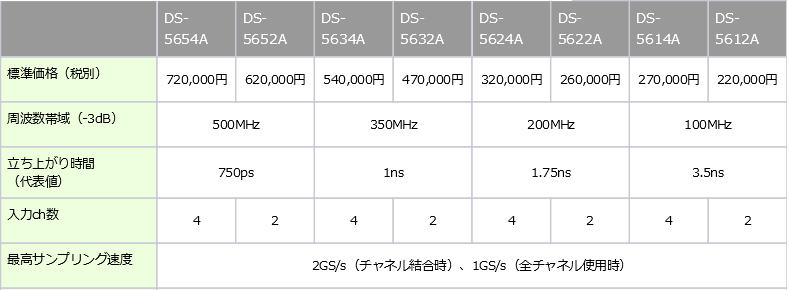 ■100MHz~500MHz(2ch、4ch)のラインナップ ■最大メモリ長5Mポイント(ch結合時) ■サンプリング速度2GS/s(ch結合時)
