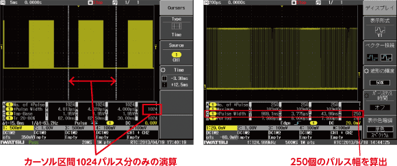 取り込んだ全周期(時間軸)の波形を自動測定します。ロングメモリで多くのデータを取り込み、最大、最小値のバラツキを見極めることができます。カーソルで挟みこまれた区間を解析することもできます。用途としては、モータの回転のなめらかさ、メカトロニクス機器のタイミングエラー、回転機器の負荷による変動、ロータリーエンコーダの回転むら、などの測定にご利用いただけます。