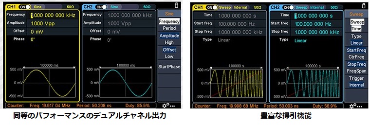 ・包括的な波形出力:6つの基本波形、 および150の内蔵任意波形