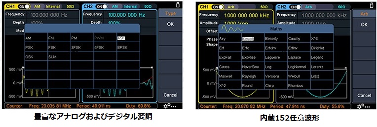 ・包括的な波形出力:6つの基本波形、および152の内蔵任意波形