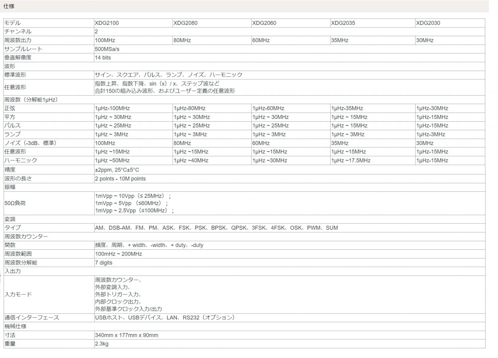 ・包括的な変調機能:AM、FM、PM、FSK、3FSK、4FSK、PSK、OSK、ASK、DSB-AM、QPSK、SUM、BPSK、PWM、スイープ、バーストなど