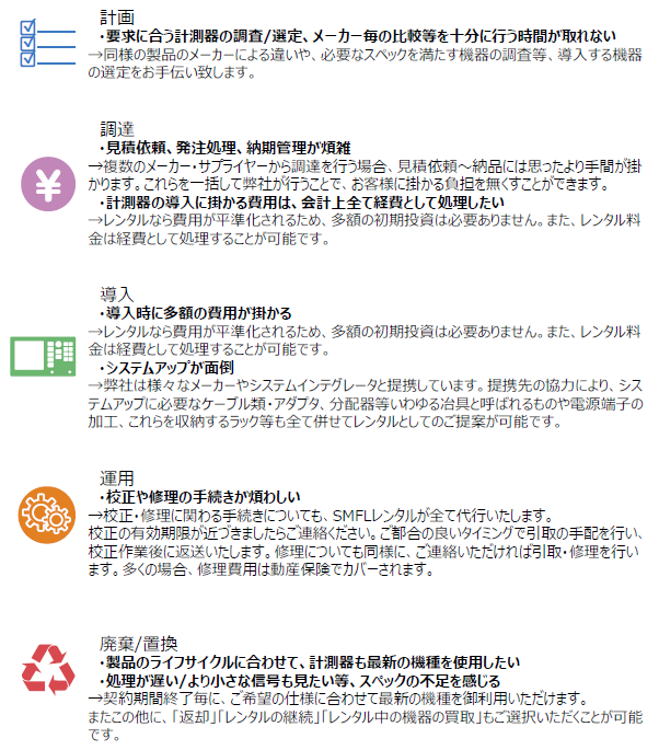 SMFLレンタルでは、計測器(システム)のご導入にあたりこれまでのレンタル会社としてのノウハウ