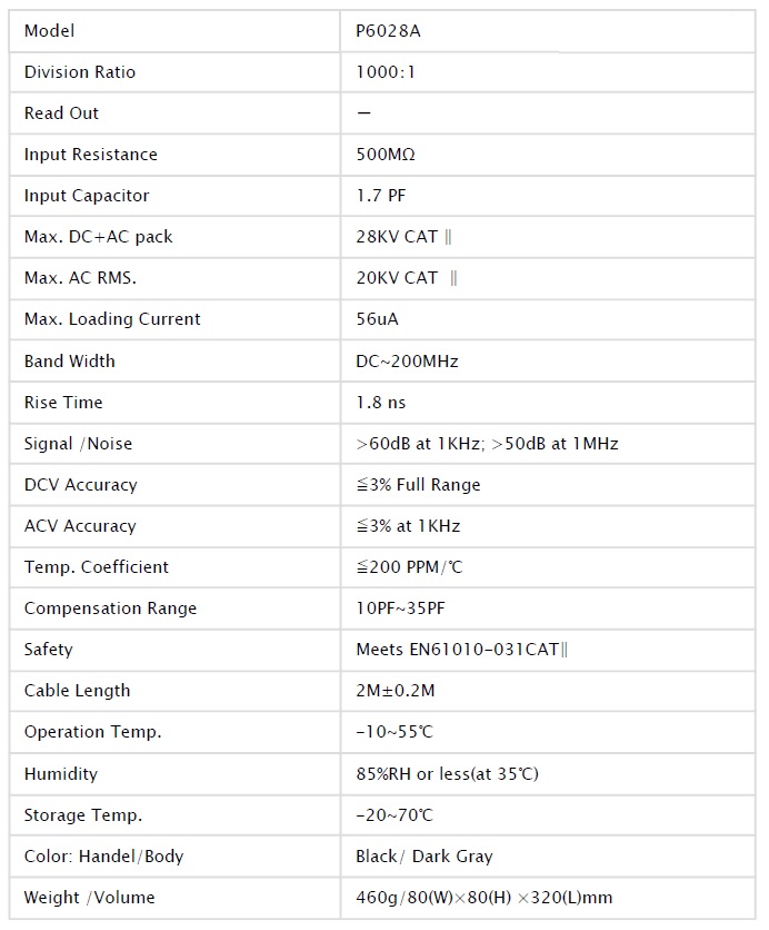 分周比1000:1。入力抵抗500MΩ。入力コンデンサ最大1.7 PF。 DC + ACパック最大28KV CAT。 AC RMS 最大20KV CAT。最大負荷電流56uA。