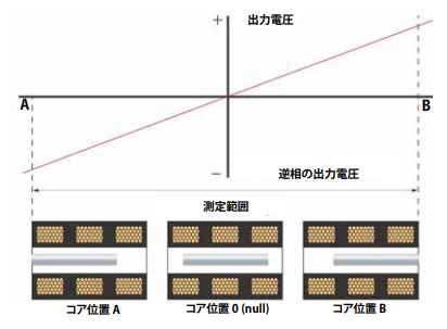 | 2次コイルAとBは直列に逆方向に接続されており、2つ の電圧VAとVBの位相は逆であり、トランスデューサーの 出力はVA-VBです。コアが中央位置にある場合、電圧は 等しくなりますが、各2次コイルの逆相が誘導されるの で結果的な出力はゼロとなります。コアが一方向に移動 すると、一方の2次コイルの電圧が上がり、もう一方が低 下します。全体的な効果として、コアの位置に比例した 出力が得られます。 励磁信号に対する出力の大きさと位相が分かっている ため、ゼロ点に対するコアの位置を推定することが出来 ます。 | |
