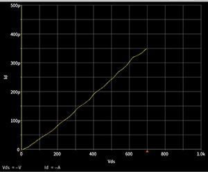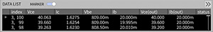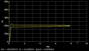 任意の電圧/電流パラメータをそれぞれX軸Y軸に設定でき、Vds Id特性、スレッショルド電圧、Vds-Vgs飽和特性等、様々な半導体特性カーブの表示が可能です。また、Y軸に複数のパラメータを設定できます。スケールは、Log/リニアの切り替えが可能です。