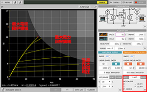 測定印加波形をオシロスコープのように時間軸で表示します。パルス幅・測定ポイント・発振などの波形異常等をリアルタイムで確認できるので、正確な測定が行えたかの検証を容易に行えます。 全ての印加波形データはX-Y表示のデータと同時に保存できるので、測定結果の再検証を行うことができます。