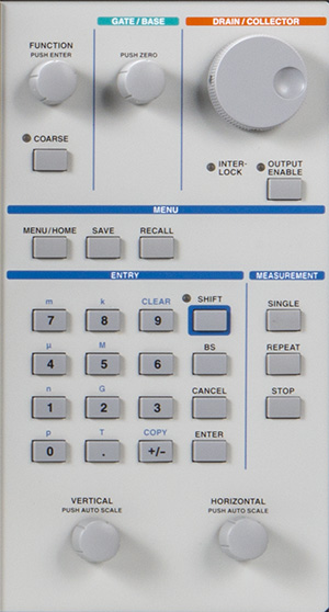 正面パネルにボタンとロータリーノブが配置されており、マニュアル測定を簡単に行えます。 中央に配置されたテンキーでは、パラメータの数値入力を行うことができます。 DRAIN/COLLECTOR・GATE/BASE・垂直軸・水平軸ロータリーノブによりマニュアル測定を簡単に行うことができます。