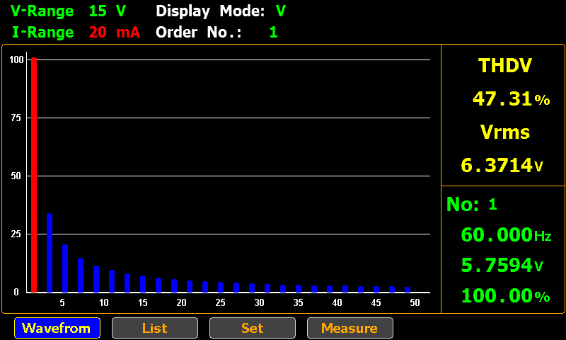 ●50次までの高調波測定、次数ごとの数値・グラフ表示による解析